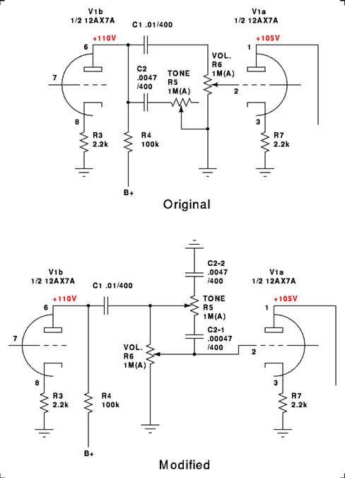 The modified circuit leaves things where they are as much as possible. The brown wire between the pots now goes to a grounded lug where it connects to the new capacitor. The blue lead was moved to the other side of the tone pot. Without this change, the pot would work backwards to the normal scheme; full treble would be counter-clockwise. The new wire is purple in the diagram; proper color coding would suggest blue wire for this, since it's closer to the plate than to the next stage's grid.