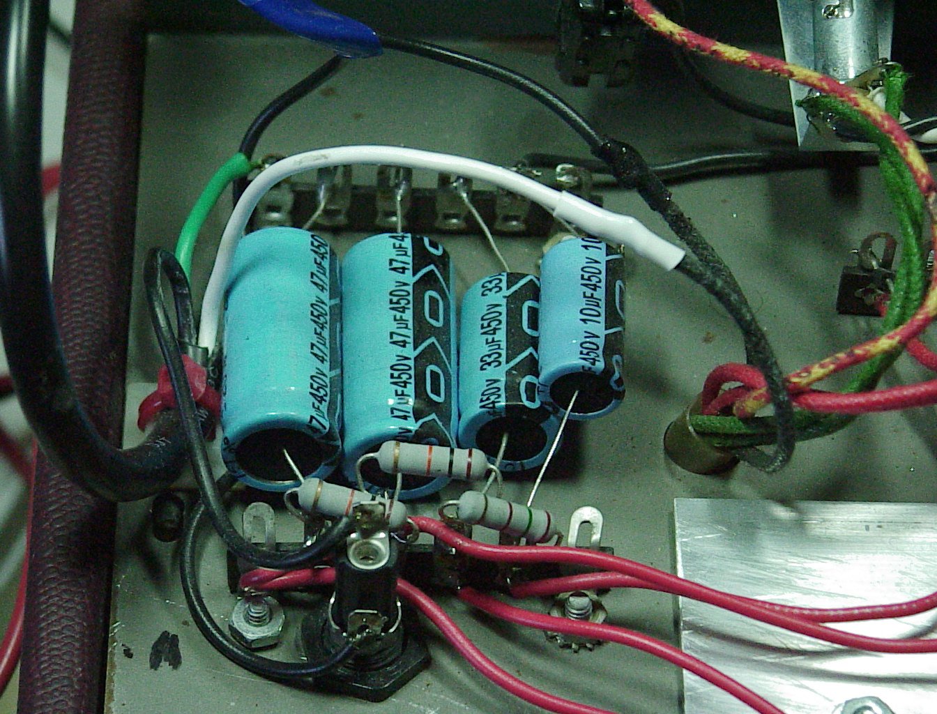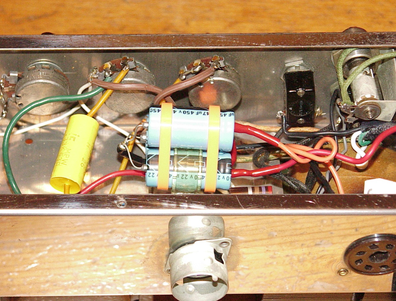 These mods are all things I have tried, someone I know has tried, or are recommended by people who work on amplifiers for a living. Nevertheless, if you try any of these, you assume all responsibility for anything that happens, whether the amp explodes, you get zapped, or the amp suddenly increases in value because everyone falls in love with it. The glory, the pain, whatever, they're all yours. If you can't live with that, don't mess with the amp!This page will attempt to guide you through replacing the power supply cap in a Kalamazoo, or other amp with multi-section caps that live inside the chassis. I'll try to get some photos or drawings up soon, but can't make any promises as to when that might happen.